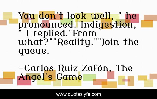 This page presents the quote "You don't look well, " he pronounced."Indigestion, " I replied."From what?""Reality.""Join the queue.". Author of this quote is Carlos Ruiz Zafón, The Angel's Game. .
