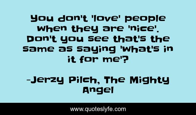 This page presents the quote "You don't 'love' people when they are 'nice'. Don't you see that's the same as saying 'what's in it for me'?". Author of this quote is Jerzy Pilch, The Mighty Angel. This quote is about love, unselfishness, genuineness, words-of-wisdom, genuine-love, people-relations, affection,.