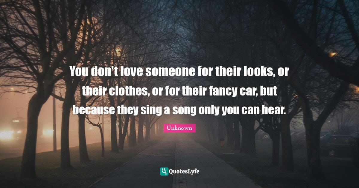 This page presents the quote "You don't love someone for their looks, or their clothes, or for their fancy car, but because they sing a song only you can hear.". Author of this quote is Unknown. This quote is about love, song, clothes, relationship, looks, fancy, love someone, romantic, car,.
