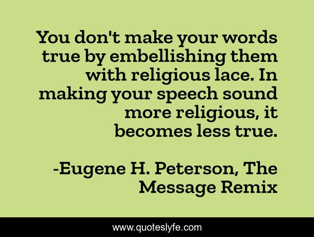 This page presents the quote "You don't make your words true by embellishing them with religious lace. In making your speech sound more religious, it becomes less true.". Author of this quote is Eugene H. Peterson, The Message Remix. This quote is about matthew, embellishment, empty-words, religious, religion,.