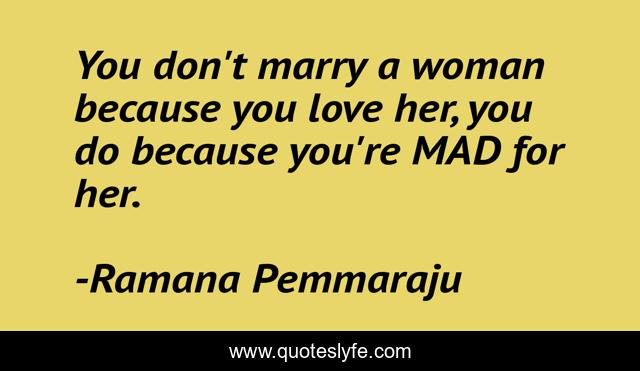This page presents the quote "You don't marry a woman because you love her, you do because you're MAD for her.". Author of this quote is Ramana Pemmaraju. This quote is about madness, psychology, marriage-advice, marriage, love, affection,.