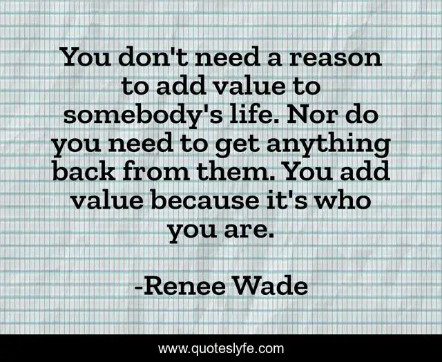 This page presents the quote "You don't need a reason to add value to somebody's life. Nor do you need to get anything back from them. You add value because it's who you are.". Author of this quote is Renee Wade. This quote is about relationships, life, value, values, inspirational, enthusiasm, friendships,.