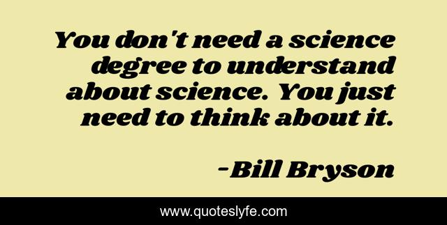This page presents the quote "You don't need a science degree to understand about science. You just need to think about it.". Author of this quote is Bill Bryson. This quote is about understand, think,.