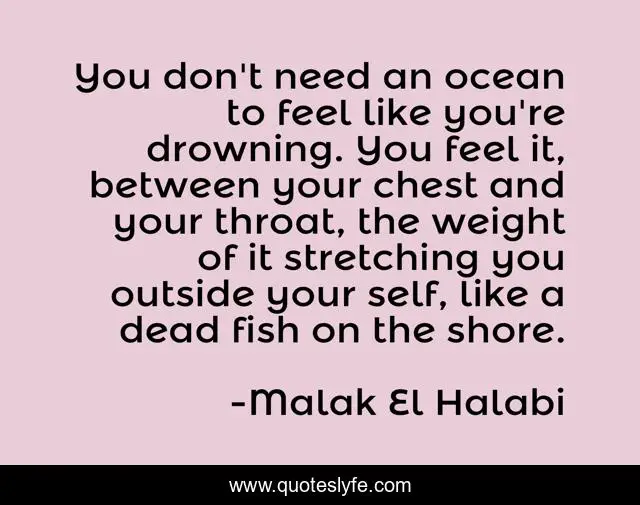 This page presents the quote "You don't need an ocean to feel like you're drowning. You feel it, between your chest and your throat, the weight of it stretching you outside your self, like a dead fish on the shore.". Author of this quote is Malak El Halabi. This quote is about drowning, hurt, pain, suffocation, ocean,.