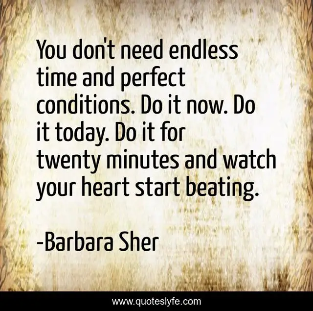 This page presents the quote "You don't need endless time and perfect conditions. Do it now. Do it today. Do it for twenty minutes and watch your heart start beating.". Author of this quote is Barbara Sher. .