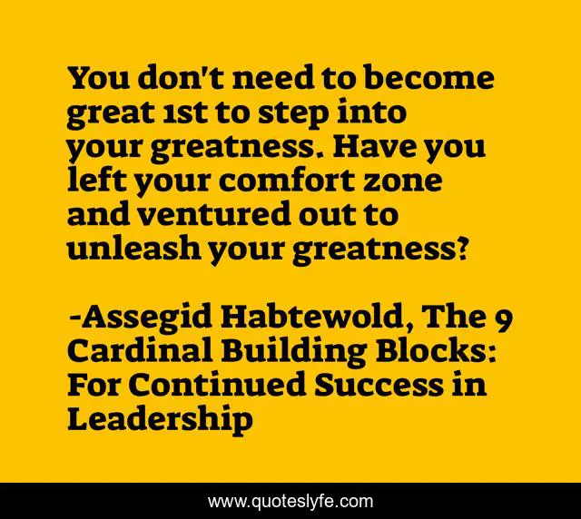 This page presents the quote "You don't need to become great 1st to step into your greatness. Have you left your comfort zone and ventured out to unleash your greatness?". Author of this quote is Assegid Habtewold, The 9 Cardinal Building Blocks: For Continued Success in Leadership. This quote is about comfort-zone, greatness, step-into-your-greatness, unleash,.