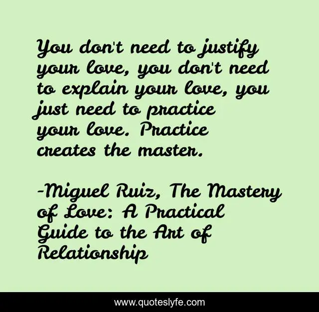 This page presents the quote "You don't need to justify your love, you don't need to explain your love, you just need to practice your love. Practice creates the master.". Author of this quote is Miguel Ruiz, The Mastery of Love: A Practical Guide to the Art of Relationship. This quote is about mastery, practice, love, affection,.