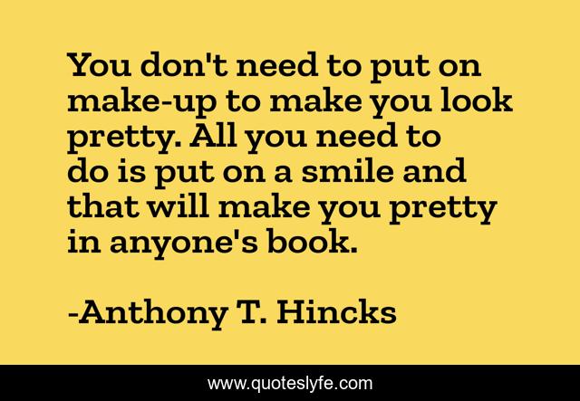 This page presents the quote "You don't need to put on make-up to make you look pretty. All you need to do is put on a smile and that will make you pretty in anyone's book.". Author of this quote is Anthony T. Hincks. This quote is about love, anyone-s-book, philosophy, anyone, affection, pretty, make-up, smile, happiness,.