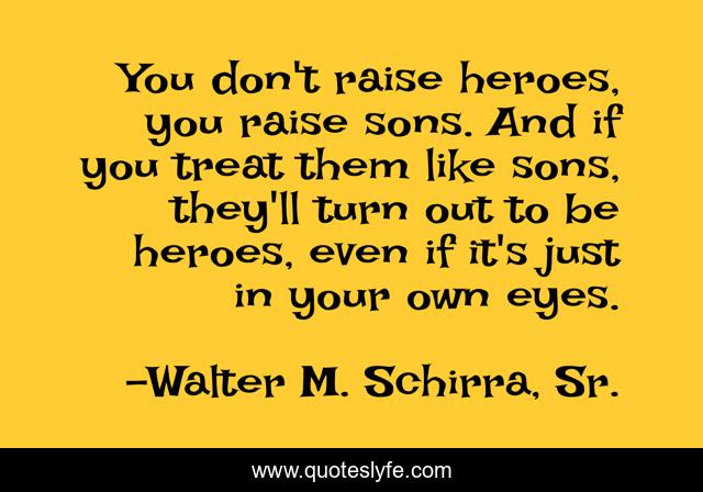 This page presents the quote "You don't raise heroes, you raise sons. And if you treat them like sons, they'll turn out to be heroes, even if it's just in your own eyes.". Author of this quote is Walter M. Schirra, Sr.. This quote is about heroes, father, son,.