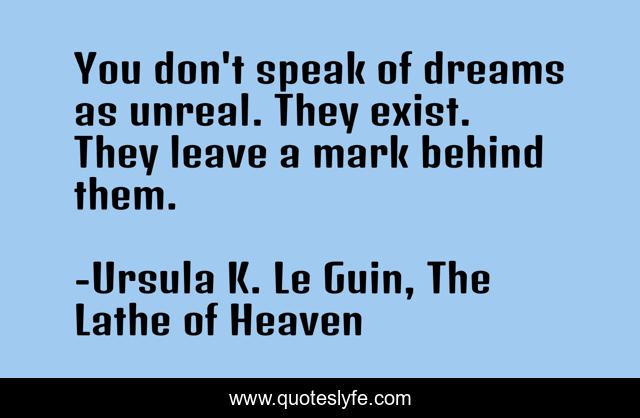 This page presents the quote "You don't speak of dreams as unreal. They exist. They leave a mark behind them.". Author of this quote is Ursula K. Le Guin, The Lathe of Heaven. This quote is about dream, dreams, reality,.