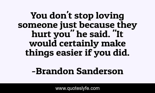 This page presents the quote "You don't stop loving someone just because they hurt you" he said. "It would certainly make things easier if you did.". Author of this quote is Brandon Sanderson. This quote is about love, affection, hurt,.