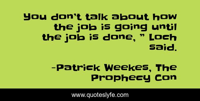 This page presents the quote "You don’t talk about how the job is going until the job is done, ” Loch said.". Author of this quote is Patrick Weekes, The Prophecy Con. This quote is about the-job, luck,.