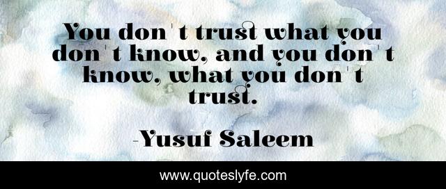 This page presents the quote "You don't trust what you don't know, and you don't know, what you don't trust.". Author of this quote is Yusuf Saleem. This quote is about enthusiasm, perception, inspirational,.
