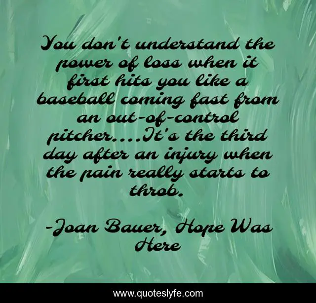 This page presents the quote "You don't understand the power of loss when it first hits you like a baseball coming fast from an out-of-control pitcher....It's the third day after an injury when the pain really starts to throb.". Author of this quote is Joan Bauer, Hope Was Here. This quote is about loss, baseball-metaphors, pain,.