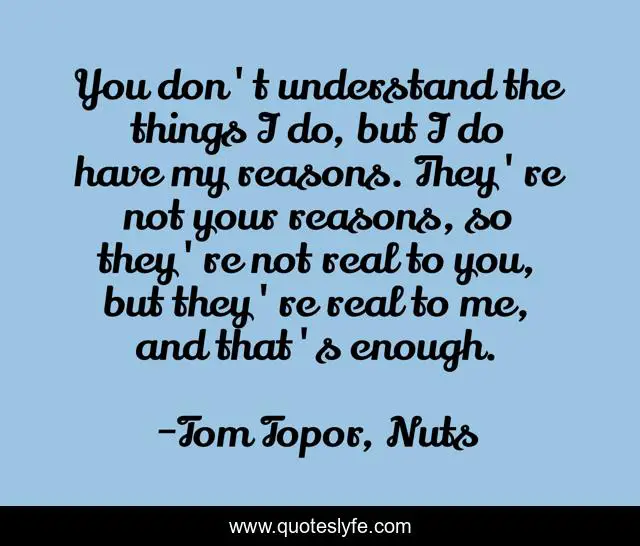 This page presents the quote "You don't understand the things I do, but I do have my reasons. They're not your reasons, so they're not real to you, but they're real to me, and that's enough.". Author of this quote is Tom Topor, Nuts. .