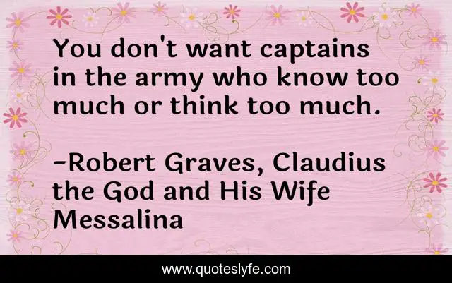 This page presents the quote "You don't want captains in the army who know too much or think too much.". Author of this quote is Robert Graves, Claudius the God and His Wife Messalina. This quote is about discipline, following-orders, army, obedience, 40, 1935, narcissus,.