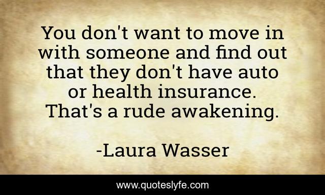 This page presents the quote "You don't want to move in with someone and find out that they don't have auto or health insurance. That's a rude awakening.". Author of this quote is Laura Wasser. .