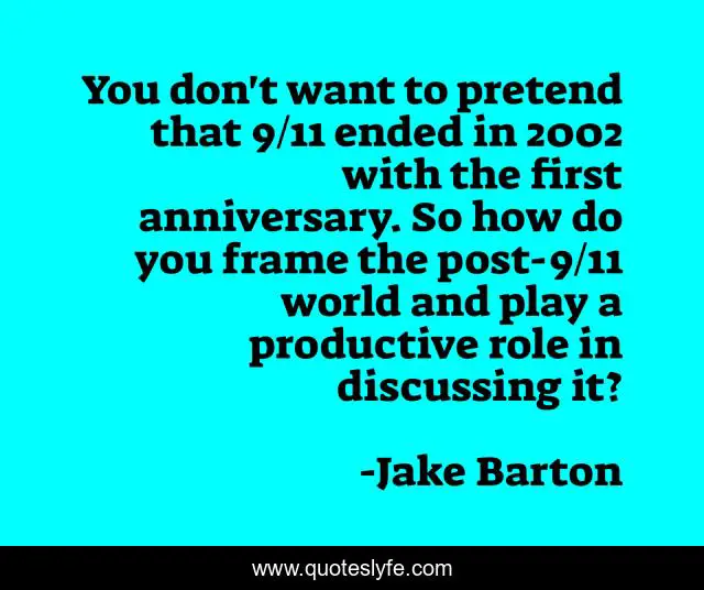 This page presents the quote "You don't want to pretend that 9/11 ended in 2002 with the first anniversary. So how do you frame the post-9/11 world and play a productive role in discussing it?". Author of this quote is Jake Barton. This quote is about world, play,.