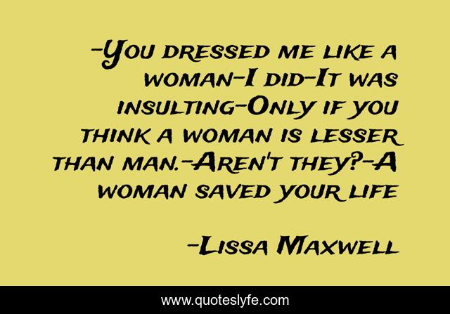 This page presents the quote "-You dressed me like a woman-I did-It was insulting-Only if you think a woman is lesser than man.-Aren't they?-A woman saved your life". Author of this quote is Lissa Maxwell. .