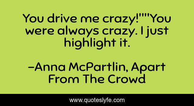This page presents the quote "You drive me crazy!""You were always crazy. I just highlight it.". Author of this quote is Anna McPartlin, Apart From The Crowd. This quote is about crazy, love, affection, neurotic,.