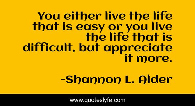 This page presents the quote "You either live the life that is easy or you live the life that is difficult, but appreciate it more.". Author of this quote is Shannon L. Alder. This quote is about paths, follow-your-heart, love, crossroads, better-choices, dreams, affection, better-people,.