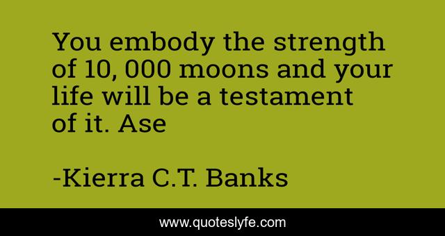 This page presents the quote "You embody the strength of 10, 000 moons and your life will be a testament of it. Ase". Author of this quote is Kierra C.T. Banks. This quote is about life, anxiety, love, advocate, depression, wisdom, journey, qoutes, strength,.