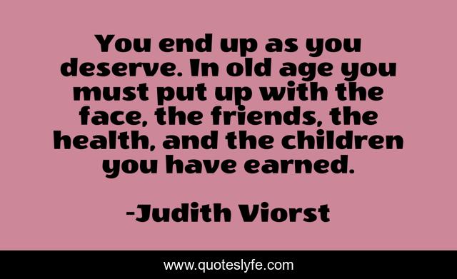 This page presents the quote "You end up as you deserve. In old age you must put up with the face, the friends, the health, and the children you have earned.". Author of this quote is Judith Viorst. This quote is about friends, health, children,.