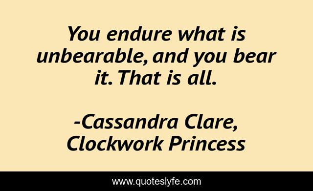 "Cassandra Clare, Clockwork Princess Quotes." Quoteslyfe.com, 2025. Wed. 10 Dec. 2025. <https://www.quoteslyfe.com/quote/You-endure-what-is-unbearable-and-you-1898>.