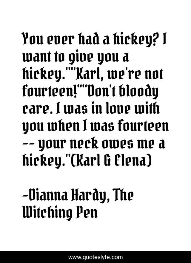 This page presents the quote "You ever had a hickey? I want to give you a hickey.""Karl, we're not fourteen!""Don't bloody care. I was in love with you when I was fourteen -- your neck owes me a hickey."(Karl & Elena)". Author of this quote is Dianna Hardy, The Witching Pen. This quote is about dianna-hardy, humor, humorous, romance, elena, the-witching-pen, paranormal-romance, karl,.