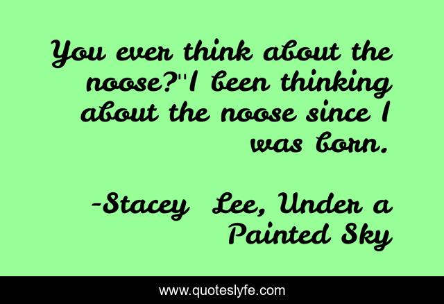 This page presents the quote "You ever think about the noose?''I been thinking about the noose since I was born.". Author of this quote is Stacey Lee, Under a Painted Sky. This quote is about lynching, stacey-lee, under-a-painted-sky, slavery, race-relations, noose, annamae, sammy, runaway,.