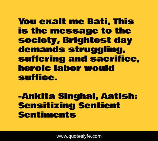 This page presents the quote "You exalt me Bati, This is the message to the society, Brightest day demands struggling, suffering and sacrifice, heroic labor would suffice.". Author of this quote is Ankita Singhal, Aatish: Sensitizing Sentient Sentiments. This quote is about poem, poetry-life, sacrifice, poetry, society, lamp,.