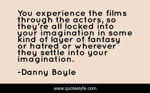 This page presents the quote "You experience the films through the actors, so they're all locked into your imagination in some kind of layer of fantasy or hatred or wherever they settle into your imagination.". Author of this quote is Danny Boyle. This quote is about fantasy, experience,.