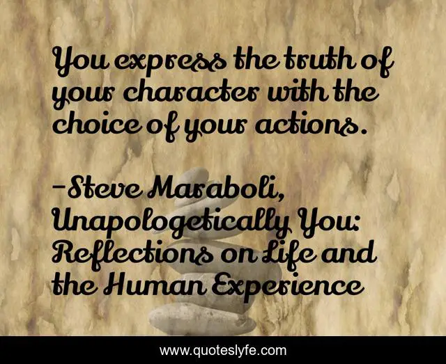 This page presents the quote "You express the truth of your character with the choice of your actions.". Author of this quote is Steve Maraboli, Unapologetically You: Reflections on Life and the Human Experience. This quote is about character, actions, truth, choices,.