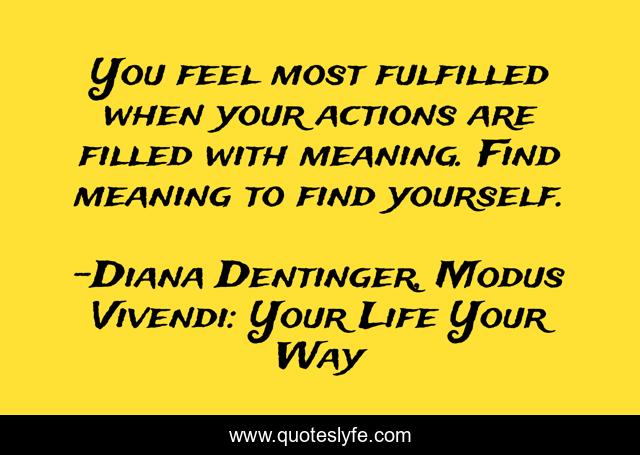 This page presents the quote "You feel most fulfilled when your actions are filled with meaning. Find meaning to find yourself.". Author of this quote is Diana Dentinger, Modus Vivendi: Your Life Your Way. This quote is about spiritual-growth, confidence, meaning-of-life, personal-growth, positive, motivational, life-purpose, optimistic, inspirational,.