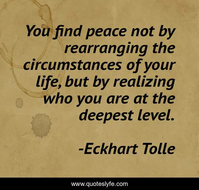 This page presents the quote "You find peace not by rearranging the circumstances of your life, but by realizing who you are at the deepest level.". Author of this quote is Eckhart Tolle. .