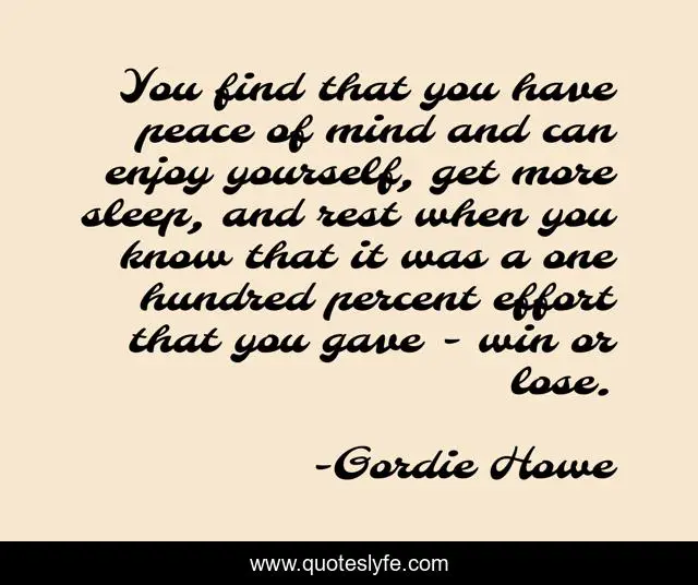 This page presents the quote "You find that you have peace of mind and can enjoy yourself, get more sleep, and rest when you know that it was a one hundred percent effort that you gave - win or lose.". Author of this quote is Gordie Howe. This quote is about mind, effort, sleep,.