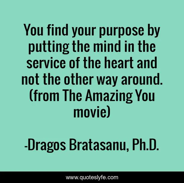 This page presents the quote "You find your purpose by putting the mind in the service of the heart and not the other way around. (from The Amazing You movie)". Author of this quote is Dragos Bratasanu, Ph.D.. This quote is about heart, educational, movie, life-purpose, movies, follow-your-dreams, purpose,.