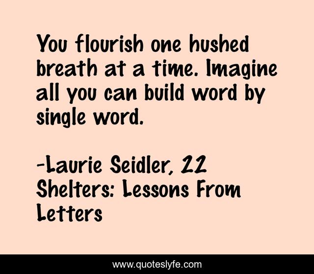This page presents the quote "You flourish one hushed breath at a time. Imagine all you can build word by single word.". Author of this quote is Laurie Seidler, 22 Shelters: Lessons From Letters. This quote is about breathe, writing-inspiration, words,.