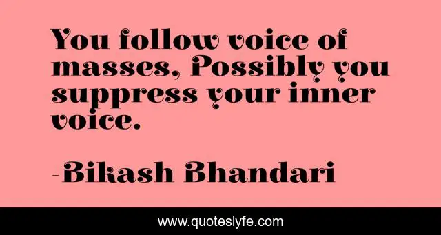 This page presents the quote "You follow voice of masses, Possibly you suppress your inner voice.". Author of this quote is Bikash Bhandari. This quote is about righteousness, masses, voices, politics, leadership, inspirational, gut, enthusiasm, mass-media,.