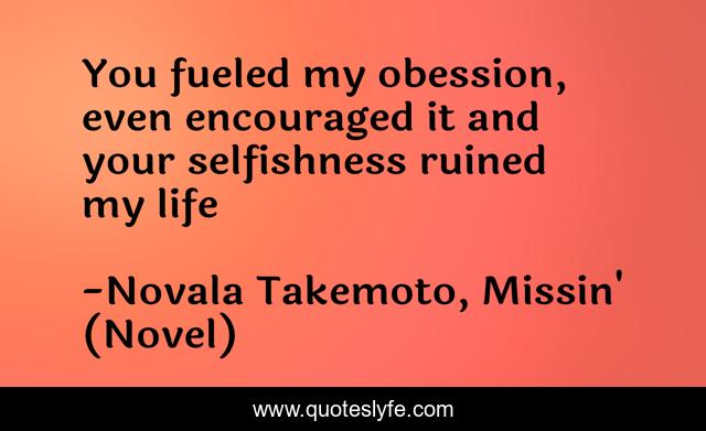 This page presents the quote "You fueled my obession, even encouraged it and your selfishness ruined my life". Author of this quote is Novala Takemoto, Missin' (Novel). .