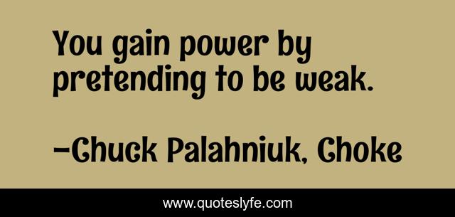 This page presents the quote "You gain power by pretending to be weak.". Author of this quote is Chuck Palahniuk, Choke. This quote is about ckoke, weak, power,.