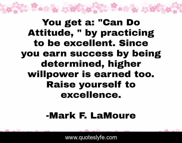This page presents the quote "You get a: "Can Do Attitude, " by practicing to be excellent. Since you earn success by being determined, higher willpower is earned too. Raise yourself to excellence.". Author of this quote is Mark F. LaMoure. This quote is about exceptional-people, high-caliber, high-quality, success, positive, excellent-people, excellent, confidence, excellence,.