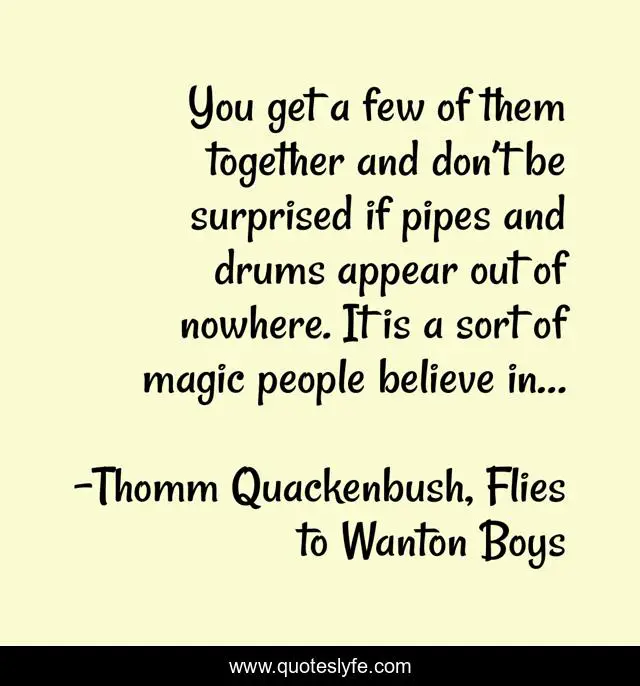 This page presents the quote "You get a few of them together and don’t be surprised if pipes and drums appear out of nowhere. It is a sort of magic people believe in…". Author of this quote is Thomm Quackenbush, Flies to Wanton Boys. This quote is about magic, music,.