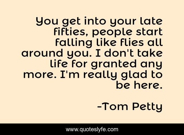 This page presents the quote "You get into your late fifties, people start falling like flies all around you. I don't take life for granted any more. I'm really glad to be here.". Author of this quote is Tom Petty. This quote is about start, people,.
