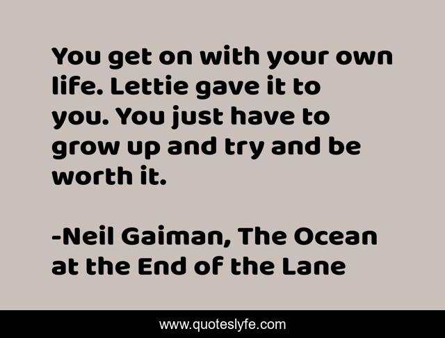 This page presents the quote "You get on with your own life. Lettie gave it to you. You just have to grow up and try and be worth it.". Author of this quote is Neil Gaiman, The Ocean at the End of the Lane. This quote is about living, life, sacrifice, birth, meaning-of-life, worth,.