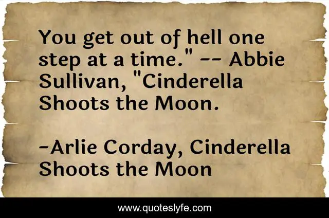 This page presents the quote "You get out of hell one step at a time." -- Abbie Sullivan, "Cinderella Shoots the Moon.". Author of this quote is Arlie Corday, Cinderella Shoots the Moon. This quote is about teens, abuse, friendship, family,.