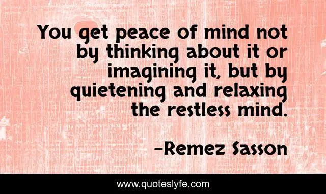 This page presents the quote "You get peace of mind not by thinking about it or imagining it, but by quietening and relaxing the restless mind.". Author of this quote is Remez Sasson. This quote is about meditation, morning,.