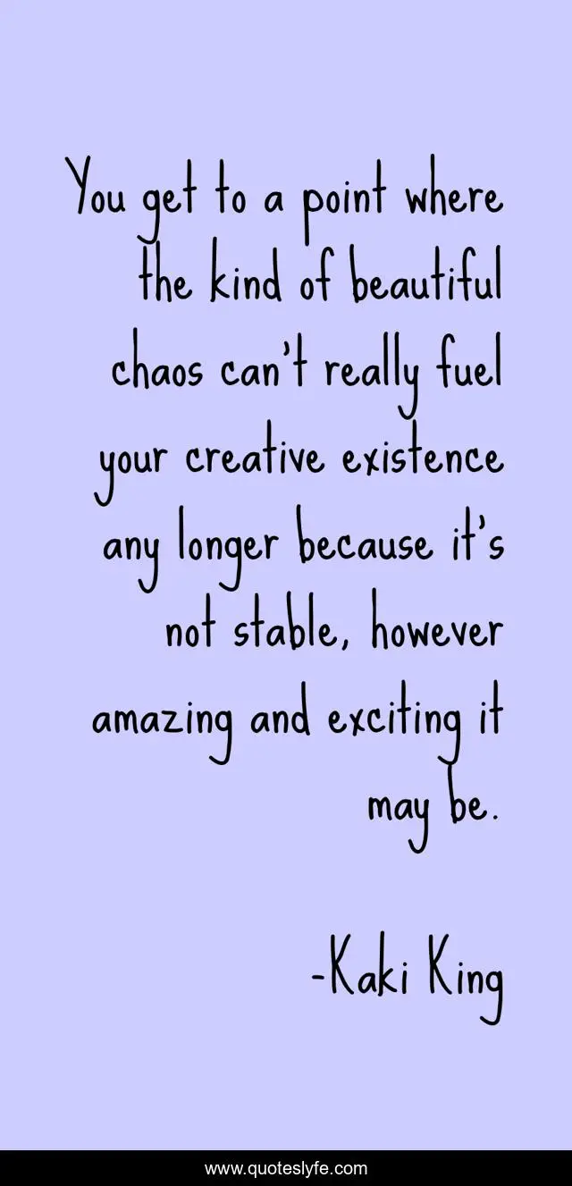 This page presents the quote "You get to a point where the kind of beautiful chaos can't really fuel your creative existence any longer because it's not stable, however amazing and exciting it may be.". Author of this quote is Kaki King. This quote is about beautiful, chaos, creative,.