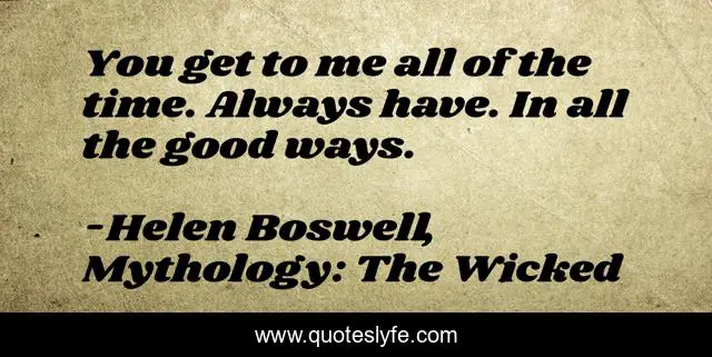 This page presents the quote "You get to me all of the time. Always have. In all the good ways.". Author of this quote is Helen Boswell, Mythology: The Wicked. This quote is about micah, love, demons, affection, mythology,.