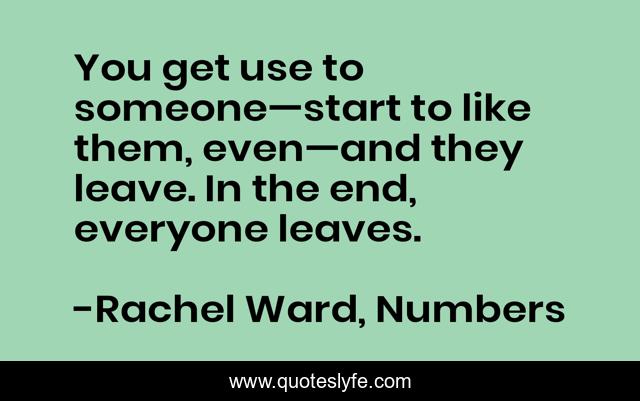 This page presents the quote "You get use to someone—start to like them, even—and they leave. In the end, everyone leaves.". Author of this quote is Rachel Ward, Numbers. This quote is about gone, end, lost, leaving, goodbye, love, pain, affection,.